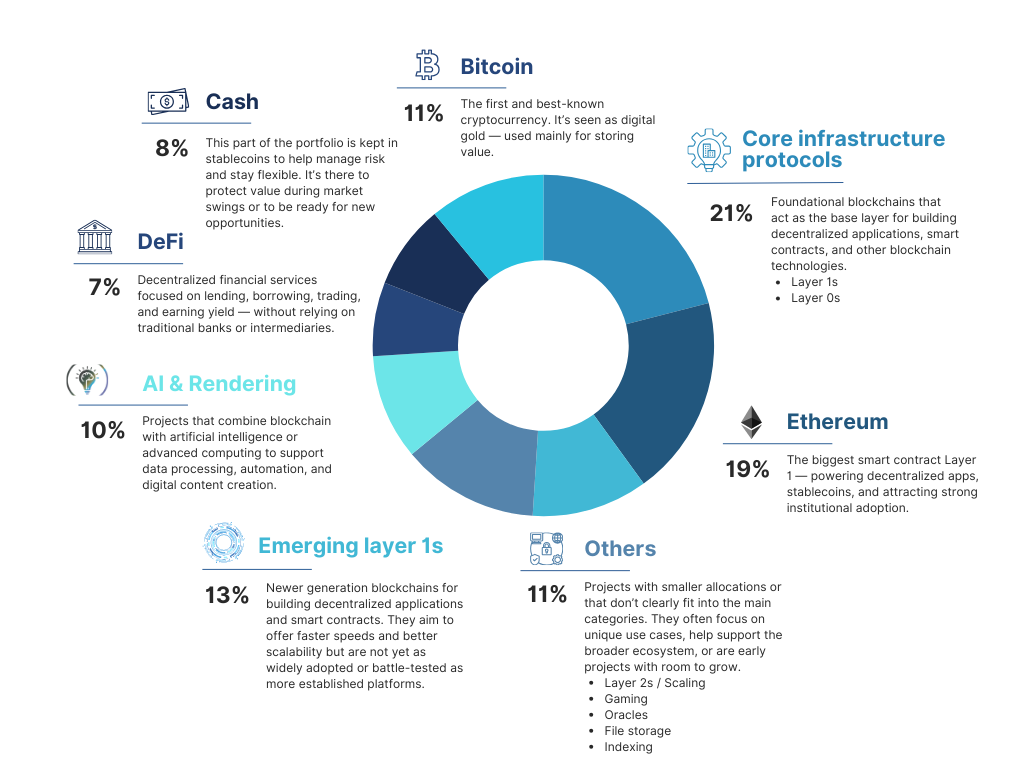 We employ the risk-management techniques used by traditional investment firms, ensuring a disciplined and strategic approach. Beyond established assets, we also invest in innovative blockchain projects and emerging companies, positioning our portfolio at the forefront of the digital economy.